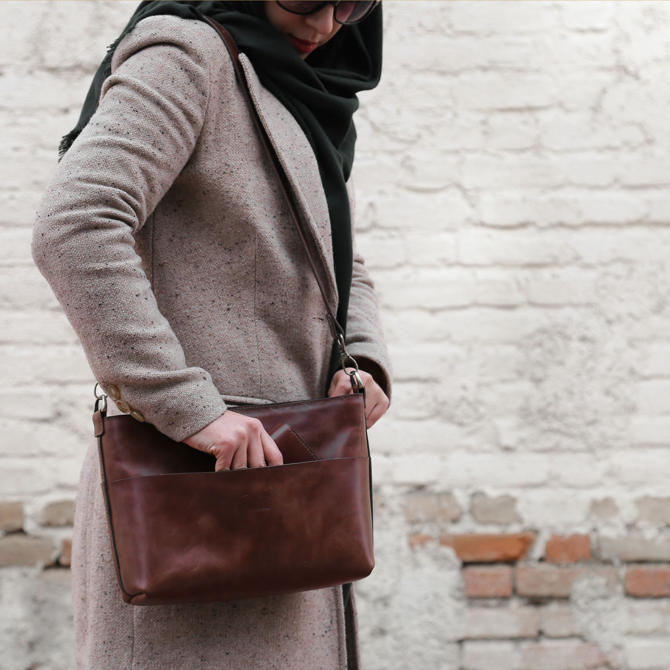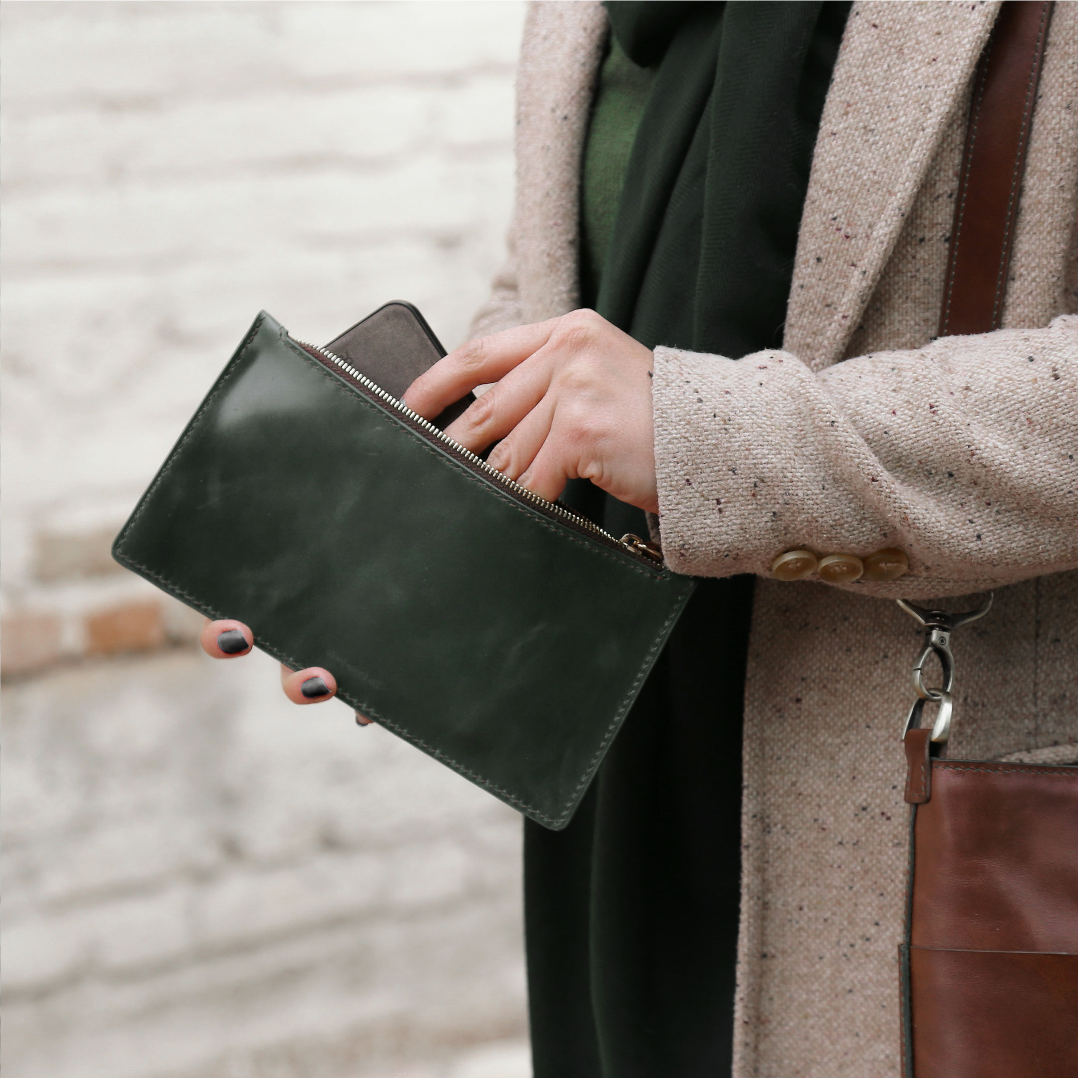 code:s44 دست ساخته تمام چرم آستر چرم بزی شامل یک جیب زیپدار داخل بدنه کیف و یک بخش زیپدار که